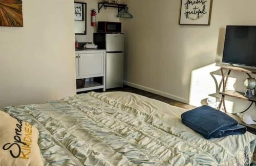 The room has a separate entrance 1 queen bed, and a private bathroom perfect for 1-2 people, equipped with a fridge, microwave, TV, and more!
