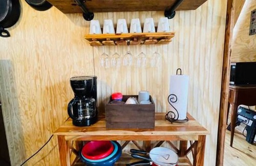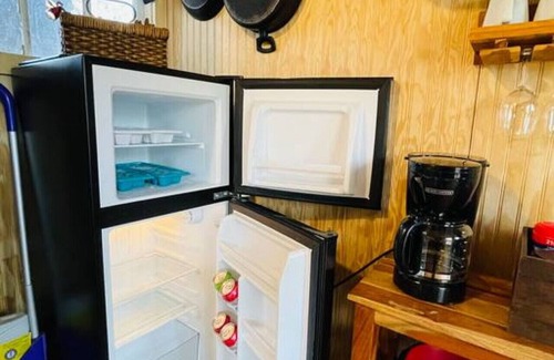 When you first walk into the treehouse, you'll enter into the common area where we have a full size futon with extra bedding (sleeps 2). Also in the common room is a deep sink, a small refrigerator, cooking essentials (pots, pans, mixing bowls, plates, cups, silverware, coffee maker, etc.).