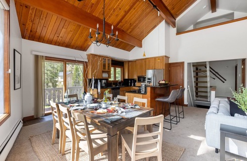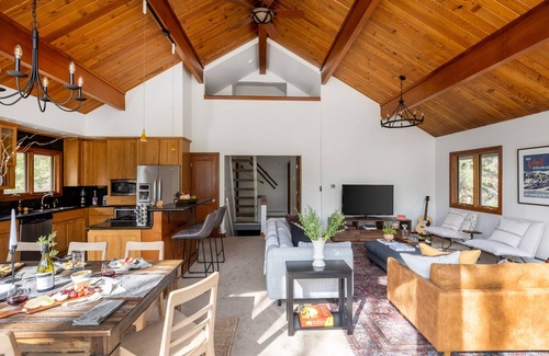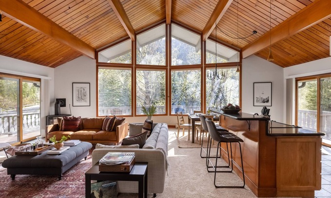 Tucked away in the trees, this private mountain home provides seclusion in an idyllic, natural setting. The home’s interior is bright and contemporary with soaring vaulted ceilings, spacious rooms, and plush furnishings. An open floor plan, floor-to-ceiling windows, and two private units downstairs, both of which have kitchenettes, mean your group will have ample space to spread out. Whether you’re unwinding after a day of hiking or skiing, your crew can indulge in cocktails by the fireplace or gaze at the stars from the newly added hot tub.