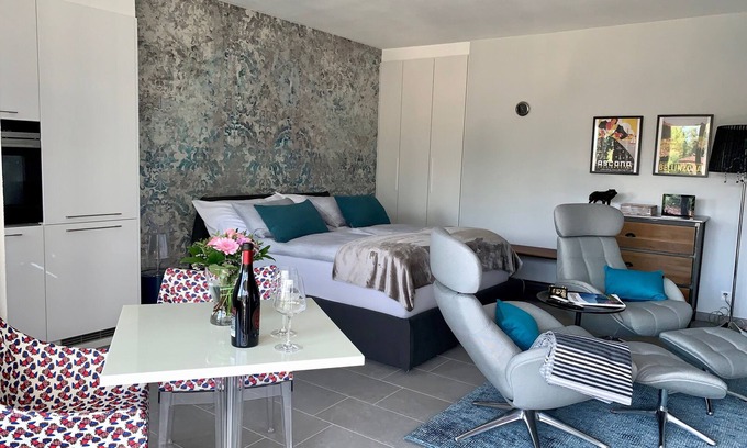 Offenes Wohnen in 45 m² 1.5 Zimmer Wohnung mit Sonnenbalkon auf der 2. Etage – für Italienische Design Liebhaber, die originalen Möbel von Kartell kombinieret mit eleganten Foscarini Beleuchtung. Das hochwertige komfortabel Bett (160X200) sorgt für erholsamer Schlaf. Zwei Relax-Sessel vis á vis zum schönsten Blick durch die grosse Fensterfront auf die Berge. Eine voll ausgestattete Küche steht für alle kulinarischen Bedürfnisse zur Verfügung. Der grosse sonnige Balkon lädt zum Entspannen mit einem Bestuhlung und einem Relaxsofa ein. Die Wohnung war in Mai 2019 komplett renovieret.