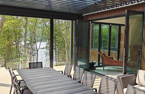 Lake front, wood fireplace, hot tub with lakeview, steam room, quite non motorized lake, 4 season outdoor veranda kitchen with gas BBQ - gas oven-stove - gas Pizza oven, gas fire place, outdoor lounge / dining. Less than15 minutes away: ski hills, navigable Lake St Joseph, Lake des Sables, cross country skiing - biking - hiking - acro-nature - water park, SPA, groceries, Sainte-Agathe, Saint Sauveur, Morin Heights.......