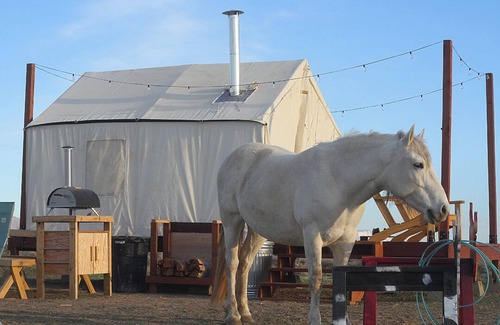 The tent is spacious enough to stand, stretch, and truly unwind. Inside, you'll find a real queen-size bed with fresh linens, extra pillows, a cowhide blanket for chilly nights, propane heater, wood furnace and solar-powered lighting for cozy evenings.