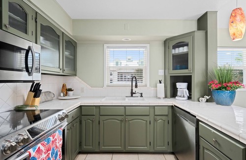 The living room and dining room have an open concept with plenty of seating for relaxing and dining. The dining table will seat six (6) with room for two (2) more at the bar area.There is a large flat screen tv in the living area with ROKU. You can also log in to your favorite streaming app during your stay.Cooking during your stay will be a breeze in this kitchen. It is also fully stocked with most kitchen wares and offers a dishwasher, microwave, and regular Mr. Coffee coffee pot. Guests will also have access to the garage for parking and storing your items during your stay. The laundry room is located downstairs. This room opens to the back patio and offers extra room for storage of your pool accessories or kayaks.