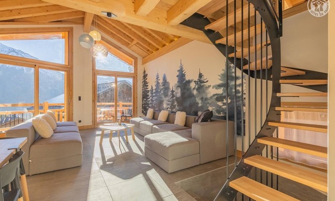 Chalet on the side of a slope on 4 floors, including a second gite. Independent access. On the ground floor: entrance with 2 bedrooms (1 double bed 160 x 200cm) opening onto a balcony and (2 single beds 90 x 200cm). In the basement: 2 bedrooms (1 double bed 160 x 200cm) and (4 bunk beds 90 x 200cm) opening onto a terrace. Wellness area shared with the other gite including a sauna and a jacuzzi (private slots, see the terms with the owner). On the 1st floor: dining room, living room, kitchen and living room with TV and WiFi connection, opening onto a balcony terrace. On the 2nd floor: 1 bedroom (1 double bed 160x200cm) with a small balcony. Each bedroom has its own bathroom (shower) and private WC. 3 private parking spaces in front of the chalet. Each floor has its exterior (terrace or balcony). Modern chalet built in 2023, gite in the heart of the village of Champagny en Vanoise, 500 meters from the slopes and the gondola. South-east/south-west transverse exposure. Decoration with clean lines, light wood and pastel shades. Quality furniture and a mix of wool and fur for a mountain atmosphere. Large living spaces to share on four floors. Very close to shops and services.