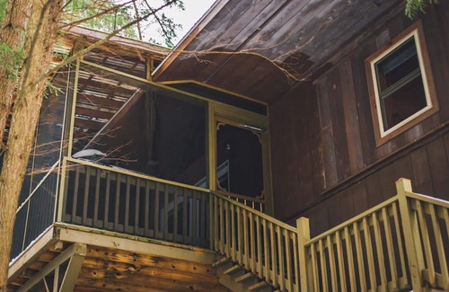 You'll enter this cabin up a staircase through the screened-in porch. Located on a hill and set back from the lake, this retreat offers a peaceful escape with easy access to all amenities