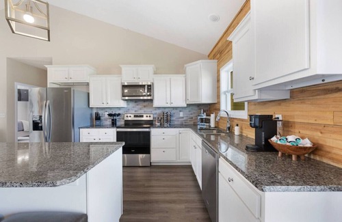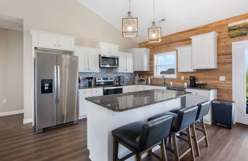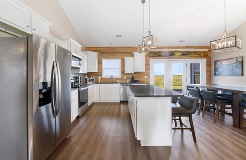 Step inside Birdie Hideaway and feel the openness of a home designed for gathering. The airy living room flows seamlessly into the modern kitchen, where meals and laughter come together with ease. As the sun sets, sink into a chair by the fire pit and watch the prairie stretch endlessly before you—a backdrop made for unwinding. The kitchen is fully stocked with everything you need to create memorable meals, while blazing-fast WiFi, big TVs, and a complimentary coffee and tea bar ensure your stay is as connected and comfortable as you want it to be.