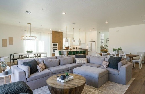 On the main level is a spacious master bedroom with a view of the golf course and pool area. If you want to open the home to the backyard paradise, accordion-style doors open the entire living room to the pool area. The spacious 4123 square foot 7 bedroom 7.5 bath private home is ideally situated on the eighth hole of the Coral Canyon Golf Course. The living room, dining room, and kitchen are open with two full-size dining tables and 6 bar seats - 26 people can sit inside for meals, play games, or do work projects. Open the California-style patio door wall to create a seamless indoor/outdoor experience with a beautiful private pool, hot tub, putting green and shuffleboard, and breathtaking golf course views.