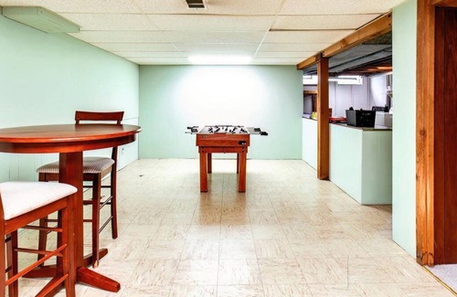 The kitchen is just off the living room and dining room and has plenty of counter space and a breakfast area, plus it is fully stocked with all the cooking basics. From there, guests can venture down to the lower level where we have lots of space and a variety of games for everyone to play. You will also find the full-size washer and dryer down there. Straight back up the steps is the three-season porch with a small table and chairs to enjoy a morning cup of coffee or an evening glass of wine. The porch lets out to our lovely fully fenced backyard with a privacy fence, two-car garage, built-in gas grill, fire pit, and outdoor patio!