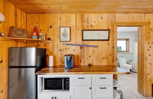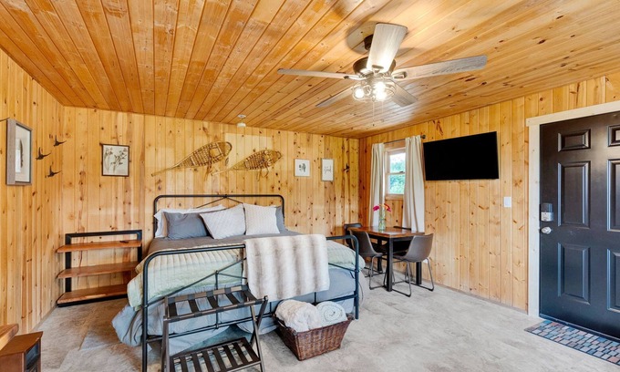Inside, the cabin combines rustic charm with modern comfort. Amenities include a fireplace, ceiling fans, a BBQ grill, wireless internet, and a private porch. Unwind with shared access to a dry sauna and fitness room. Cook up your favorites in the well-equipped kitchen with essentials like a refrigerator, microwave, and cooking utensils.