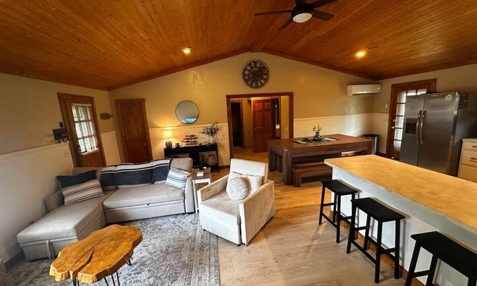 Escape to an enchanting individually climate controlled 4-bedroom cottage in Porum. This cozy retreat features 3 queen beds, 1 full bed, and a lovely living room with a sofa bed and twin bed. Guests can unwind in the 2 bathrooms equipped with a shower, bidet, and hair dryer. The kitchen table converts into a pool table and ping-pong table for family fun indoors! Enjoy the peaceful surroundings and explore all that Porum has to offer during your stay at our terrific cottage!!