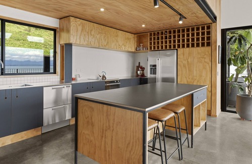 Black Barn Escape is a modern, architecturally designed home set above Nelson, offering stunning sea views and a peaceful setting. Ideal for families or groups, this spacious retreat includes a separate apartment with private external access from both the main house and parking area.