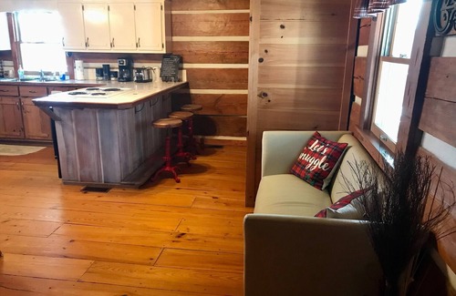 The cabin has generous deck space to enjoy the view while having a BBQ, (charcoal grill provided) relaxing in the brand new Hot Tub or having a glass of wine. Take a stroll down to the fire pit and relax in the comfortable adirondak chairs while toasting marshmallows. Now that cooler weather is here, cozy up under our weighted blankets on each bed.