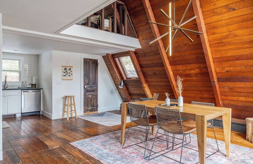 Escape to Black Pines A-Frame, a fully renovated 1961 cabin nestled in the Catskill Mountains in Kerhonkson, NY. Named one of the “Coolest A-Frames in NY” by the New York Post, this charming retreat blends rustic character with modern comforts. Set on two private acres, it offers stunning wooded views and a warm, inviting atmosphere.