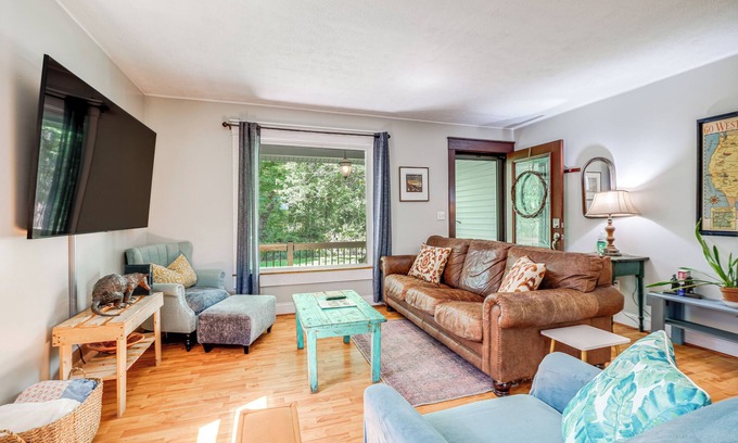 With a grassy yard surrounded by trees, a deck with a built-in hot tub, and an indoor sauna and massage table, this immensely peaceful 3-bedroom, 3-bath Blacksburg vacation rental makes it hard to believe Virginia Tech is only minutes away. Between trips to campus, rejuvenate your body and mind here, or visit local gems like 3 Birds Berry Farm, Rising Silo Brewery, and the local farmers market.