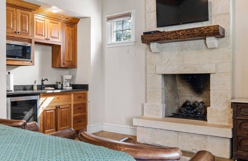 Experience a unique combination of history and luxury at this one-bedroom Fredericksburg cottage, nestled in the heart of Texas. Each of the eight cabins on the property is named after the Blacksmith children, and The Bianca is one of the most charming. Inside, you'll find a cozy stone fireplace and a flatscreen TV, along with free WiFi for added convenience. The kitchenette, though small, is well-appointed with wooden cabinets and stainless steel appliances, including a coffee maker, mini-fridge, and microwave.
