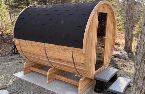 The perfect balance of modern aesthetic and the warmth of a log cabin. A charming walking path leads to your private dock with 1 tandem and 2 single kayaks! The outdoor deck is perfect for summer cocktails & dining al fresco, or relax in the hot tub and barrel sauna to unwind après ski. On rainy days gather in our cozy movie theatre!