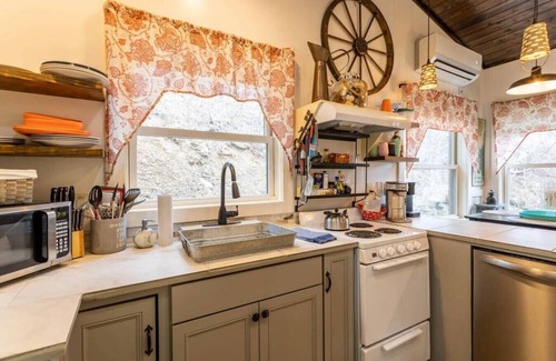 Sarah Jane's Cottage boasts new furnishings and chic modern country decor, all with relaxation and enjoyment in mind. Enjoy relaxing on the covered porch or soaking in the hot tub overlooking the gardens and pond, or sit by a fire and enjoy the night stars. Most days at dusk you can see the deer and their babies pass through while ducks teach their ducklings how to take off and land on the pond.