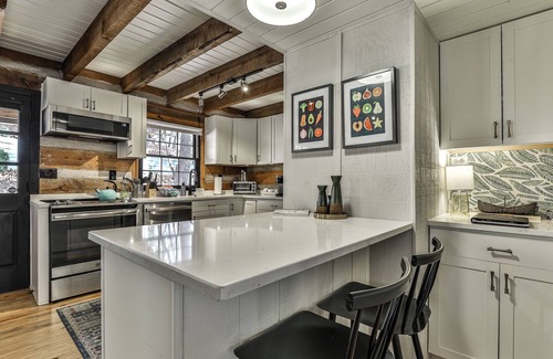 The newly renovated open-plan kitchen is well-appointed for preparing meals, coffee, or snacks. The dining table seats five and overlooks the stacked stone fireplace and hearth of the living room.