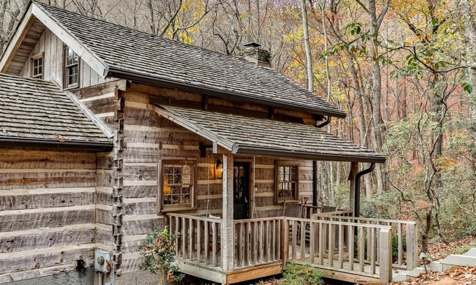 Enter the beautifully restored timber and white chink cabin through a rocking chair front porch into the open-plan dining, living area, and kitchen. The living area offers beautiful views of the wooded glen through multiple windows and a treehouse-like screened back sitting porch. Downstairs, a second living room with a TV is perfect for movie night or the game and features a stylish electric flat-screen fireplace. Behind the living room is a second screened porch sitting area, a great spot to listen to the creek or read a book. Outside, nestled at the back of the cabin, is a beautiful fire pit, perfect for relaxing and enjoying nature and the sounds of the nearby creek.