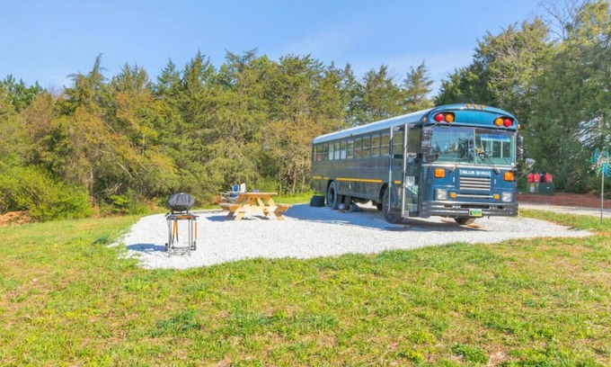 Create new family memories camping (really "Glamping") in a brand new renovated Blue Bird School Bus (Skoolie) with wide-open, jaw-dropping mountain views. The Skoolie is outfitted with everything you need... just pack clothes/food and come! Sleeps 2 adults (1 queen) and up to 4 kids (Bunk beds, pull out futon). Full electric (generator), water, kitchen and bathroom. Huge sink, stove, oven, microwave, Keurig. Wide-open mountain views, picnic table, and acres for outdoor enjoyment.