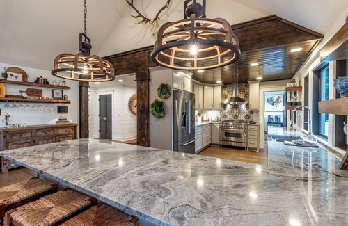 Head to the expansive porch, where you will appreciate enough room for everyone to spread out. Make memories around the large stone fireplace, take in the gorgeous scenery while relaxing around the natural fire pit, unwind in the hot tub, or use the stainless-steel gas grill and cookout for the entire family!