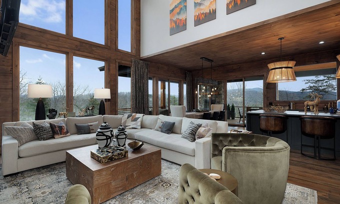 This exquisite mountain retreat nestled in the heart of Blue Ridge Georgia, offers stunning decor, design and incredible mountain views. Blue Fox is a multi-level cabin offering the perfect blend of luxury and modern charm with high end amenities, attention to detail, and spaces designed with fun and relaxation in mind.