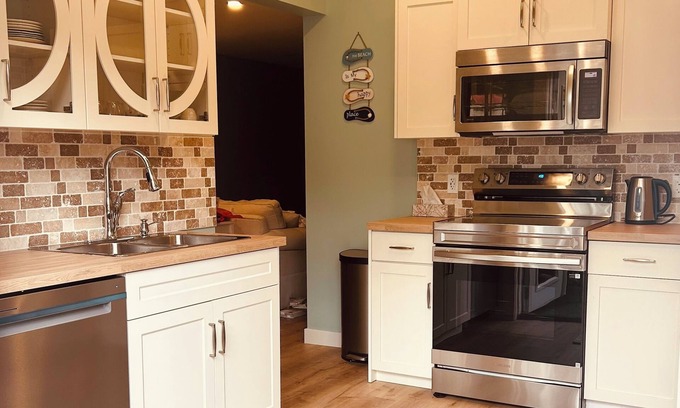 Escape to comfort and style in our beautifully appointed brand-new 1-bedroom vacation suite - all just a 7-minute walk to the shoreline. Thoughtfully designed to accommodate up to 4 guests, the suite features a cozy 1 bedroom with a queen bed and a high-quality queen cabinet bed in the living area for extra sleeping space. Perfect for couples, families, or friends. Enjoy cooking in the fully stocked kitchen, complete with brand-new appliances, or fire up the BBQ and dine al fresco in your private outdoor space. Whether you're here for a weekend escape or an extended stay, this 1-bedroom suite is the perfect base to relax, recharge, and explore everything the area has to offer.
