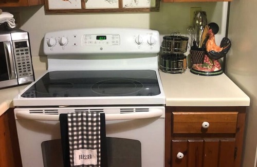 The kitchen has plenty of spices for cooking meals, a microwave, toaster, and Keurig coffee maker with a variety of pods for your convenience and comfort.