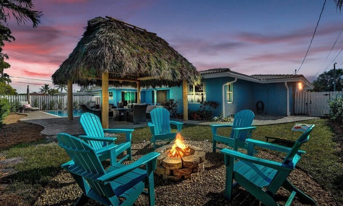This sun-filled Pompano Beach Oasis with a salt water, heated pool is the perfect place to work, stretch, and play. The double master bedroom floorplan and wide open pool patio and Tiki Bar makes it easy for you and your guests to relax and enjoy