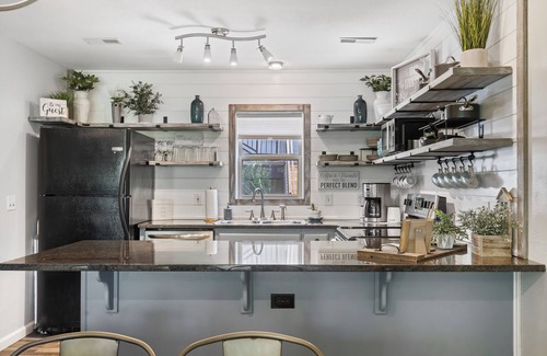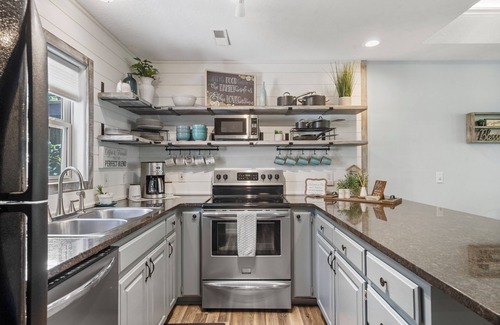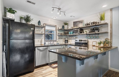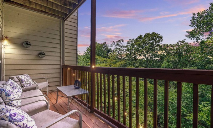 This homey condo, nestled amongst the nature of the Ozarks with a fitting rustic design, sets the scene for your entertainment-filled getaway to Branson. Enter the home’s main gathering space, where kitchen, dining, and living areas flow seamlessly into one another. An oversized sectional, facing the room’s smart tv, provides ample seating for comfortable lounging indoors. Wall to wall windows look out onto your back deck, where more seating provides views of lush green landscapes and colorful skies.