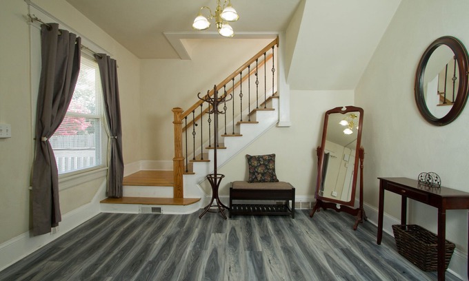 Welcome to the Blue Oasis! Come stay with us in our fully furnished 4-bedroom home that has been renovated in July 2021. The blue hue flooring will grab your attention immediately and the rest of the house will make you feel at ease. This place is made for professionals visiting Roanoke for work or leisure, with every detail in mind for you to enjoy your stay. The unit features 4 full-sized beds, a fully-stocked kitchen with a water purifier, high-speed Wi-Fi, and a TV with Prime, Netflix, and Hulu access. Digital locks for easy check-in and cameras outside keep you safe. BBQ outside or enjoy breakfast on the porch in this quiet block. Take advantage of the close proximity to all Roanoke has to offer. (Please no parties, this is a residential house and it has a noise monitor, but come have fun and enjoy.)