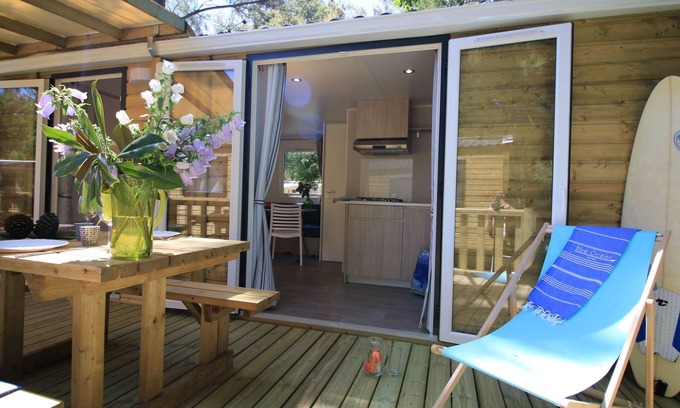 "Blue Océan Cottage Pergola 4", 3-room mobile home 24 m2. Object suitable for 2 adults + 2 children. Practical furnishings: living/dining room with dining table. Exit to the terrace. 1 room with 1 french bed (140 cm, length 190 cm). 1 room with 2 beds (80 cm, length 190 cm). Open kitchen (dishwasher, 4 gas rings, microwave, electric coffee machine). Shower, sep. WC. Electric heating. Terrace partly roofed. Terrace furniture, deck chairs (1). Facilities: children's high chair, baby cot (extra). Internet (WiFi, free). Parking (1 car). Please note: suitable for families. Non-smokers only. Maximum 1 pet/ dog allowed. Smoke alarm.