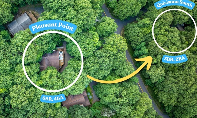 Experience the ultimate retreat with two homes across the street from one another: Pleasant Point, a 6-bed, 4-bath luxury escape with hot tub, sauna, game room with shuffleboard and arcade games, and more; and Quisisana South, a cozy 3-bed, 2-bath cabin with a hot tub, ping pong table and outdoor firepit nestled in serene woods. Perfect for family reunions, weddings and events in the heart of the Blue Ridge Mountains.