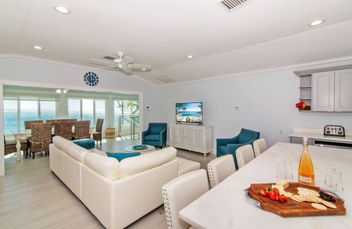 The upper-level floor plan includes a 60-foot enclosed sunroom with oceanfront windows, a formal dining table, and two sitting areas. The open-concept family room connects the kitchen and living area, ensuring ocean views from every angle. Fenced pickleball courts are across the street. The owner has some paddles and balls to share.
