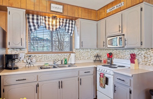 The front bedroom has a bunkbed (queen size on bottom, twin size on top) and the rear bedroom has a stand-alone queen bed. With a queen size hide-a-bed in the couch, the cabin can accommodate up to 6 people. There is one full bath with a tub/shower. All bedding, bath and kitchen linens, along with bath soap, kitchen soap, paper towels, toilet paper, salt & pepper, coffee filters, trash liners and firewood are provided.