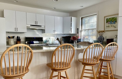 Experience the gorgeous Maine oceanfront in comfort and style at Blueberry Shore—a meticulously designed and maintained home. Located on Arey’s Cove— Blueberry Shore offers privacy, yet proximity to magical walking trails, stunning beaches, and a fresh water swimming quarry. Inside you will find an open, modern kitchen, equipped with all major appliances, granite counter tops, and a breakfast bar. The open and spacious dining and living room provide the perfect space for relaxing or entertaining. French doors take you onto a large deck with expansive views of the lawn and shore. The living area also opens onto a screened porch overlooking the water for a second dining or sitting area. The first floor includes a den with a flat screen TV , a first-floor bedroom with a queen sized bed, full bath, and a laundry room with extra refrigerator and freezer. The second level includes a luxurious master bedroom with a king size bed king, with a seating area, balcony, cathedral ceiling and dressing room with a half bath. The second level also includes a full bath, a third bedroom with a king sized bed, and a light-filled studio with water views for art, reading, or relaxing in a hammock. Outside, a landscaped lawn, complete with high-bush blueberries, sweeps down to the shore with a private dock and float. The cove is ideal for kayaking. Blueberry Shore is a perfect property for a group of up to 8. Slip away for an unforgettable week at this charming island home.