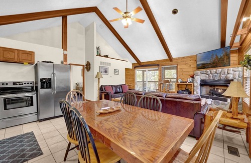 There is a covered open deck overlooking the woods below with seating for watching the wildlife and relaxing. The hot tub for this cabin is just steps away outside the great room on an elevated, screened porch at treetop level, overlooking the woods!