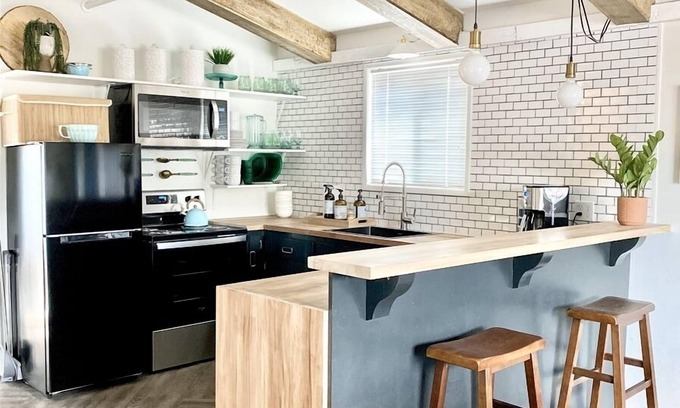 It features a fully equipped gourmet kitchen with brand new subway tile, open shelving, butcher block counters and a beautiful beamed ceiling. Dining room table is set up for family and friends with a bench & 6 chairs, plus additional chairs if needed. The living room has super cozy and comfy furniture, gas fireplace and a TV for those nights inside. Primary bedroom has a king size bed while the second bedroom has a unique bunk set up with a queen bed on the bottom and two twin beds above. Outside is a small deck with an outside bar and 4 stools.