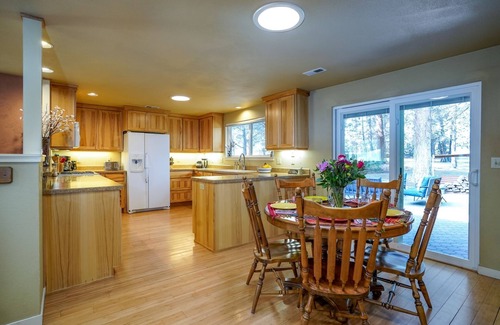 This three bedroom two bath home is equipped with a king bed in the master bedroom and an en suite master bathroom with a walk in shower. The second bedroom is equipped with a queen bed and the third bedroom is equipped with two twin beds. There is a massage table and workout area in the garage. River Hawk provides three seating areas, great for gatherings, a large surround sound HDTV and TV Room.This property is not fenced for dogs but is open to a large wooded common area filled with old ponderosas. There are many walking trails for adventures with your dog and lots of wildlife to see while sitting outside on the patio.