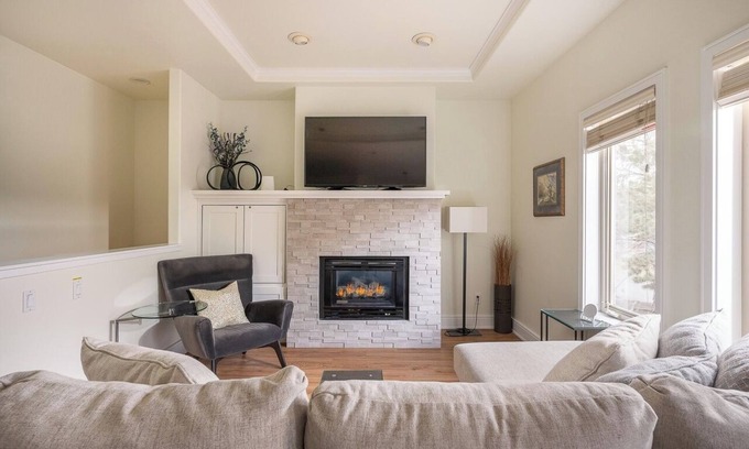 This townhome has two living spaces for family and friends to come and stay together. The lower level has a king bed, spacious living area and a private bathroom. It features a gourmet kitchen, couch and large TV.