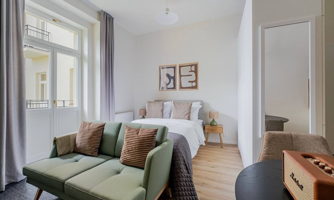 Discover the best of Prague, with this studio apartment in Holešovice. It’ll be easy to simply show up and start living in this elegantly furnished apartment with its fully equipped kitchen, pretty living room, and our dedicated, on-the-ground support. (ID #PRG61)