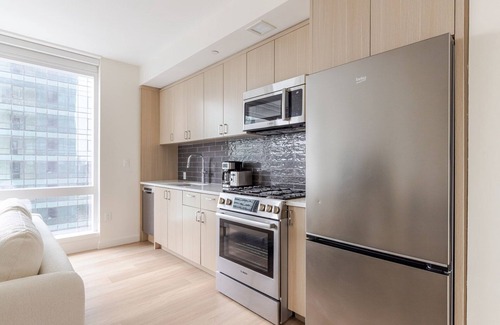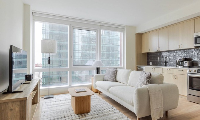 Thoughtfully designed with bespoke finishes, modern furnishings, and a fully equipped kitchen, you’ll enjoy that “I’m home” feeling with this Blueground apartment. Whether you’re lounging in your bright living room streaming the latest and greatest entertainment on the smart TV or premium wireless speaker, or getting some well-earned rest on the superior quality mattress with luxury linens, you’ll fall in love with everything this Long Island City apartment has to offer. This apartment also offers in-apartment laundry.
