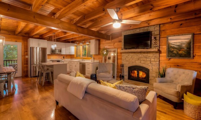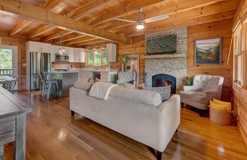 The cabin is a cross between rustic log cabin styles and cabin chic. Beautiful hardwood floors throughout the home with large, exposed beams await you. You'll fall for the custom stair railing, the immaculate stairs, and an artisan-crafted, smart fireplace. The gourmet kitchen is chic, with modern touches throughout. It's a genuinely inviting social gathering place. It's the perfect place to unwind.