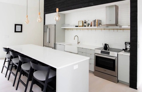 The modern kitchen is a chef's delight, equipped with everything you need to prepare delicious meals. A sleek breakfast bar with stylish stools adds a touch of elegance to your dining experience. The white tile backsplash adds a clean and sophisticated finish to the space.