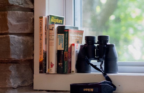 The enormous windows of this stone and beam retreat invite you outside into the exquisite natural world, while the post-modern furniture, interesting art collection, lofty ceilings and unique architecture call you back inside. Warm yourself by the wood stove in the open plan kitchen, or lounge on the original 1930s Hans Wegner sofa by the Swedish fireplace in the living room. Pick any book from the handmade farm-beam cypress bookshelf and settle in! No interruptions. The main bedroom features a high end memory foam King-size bed with breathtaking views out of a giant window. Sleeping in the tree tops. Wake up to birdsong, and enjoy your morning coffee on the main bedroom's patio overlooking English-style wild gardens and a babbling brook fed by a natural spring. The open kitchen, with a wall of solid windows framed by stone walls and beams, is the ultimate place to cook a locally sourced meal and have a glass of wine, (a bottle of which will be waiting for ya) then enjoy it in the rounded dining room with views of the forest, pond, and the house's unique interior.