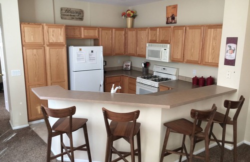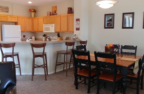 It has an open floor plan that allows people in the kitchen, living and dining areas to stay connected while cooking, eating, and watching a movie. Tall windows bring in lots of natural light. The gas fireplace adds a cozy feel. There is a large dining table (seats 6) and seating for 4 on the bar stools at the kitchen counter. A high chair and Pak-n-Play are available for the little ones.