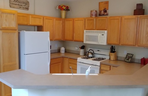 The kitchen is FULLY EQUIPPED with Cuisinart cookware and bakeware, blender, coffee pot, toaster, Pyrex dishes, roasting pan, Dutch oven, loaf pans, mixing bowls and other kitchen tools. Enjoy the wine and champagne glasses. There are matching plates and tumblers for dining on the patio if you want to cook on the gas grill. Propane is provided.