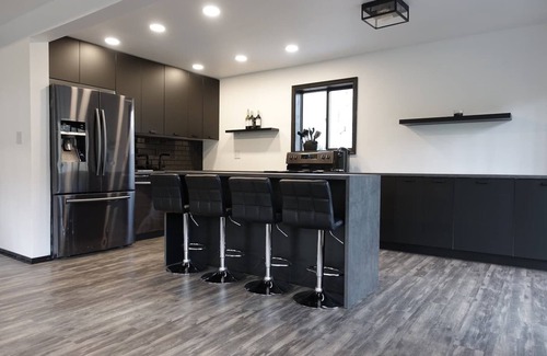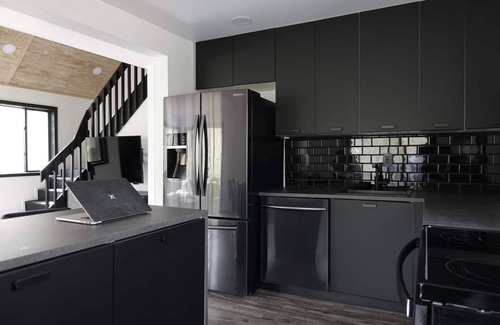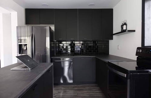 True mountain escape with designer finishes and high end appliances. The black cabin is situated near Bushkill Falls surrounded by a creek accessible for kayaking and fishing. The house is suited for six people 2 queen bedrooms and Queen Loft on the second level. Open kitchen plan that connects with the living space highlighted by a beautiful fireplace. Washer & dryer on site as well as a beautiful deck for entertaining with a fire pit. Only 20mins away from Shawnee Mountain & 24/7 Supermarket.