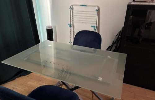 This 27-sqm studio on the 6th floor features a cozy living space with a flat-screen TV, dining area, and high-speed Wi-Fi (1 Gbps), ideal for remote work. The fully equipped kitchen includes a mini fridge, stove, Nespresso coffee machine, microwave, and essential cookware. A clothes washer, drying rack, and cleaning supplies are also provided.