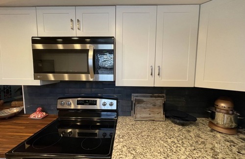 Downstairs bedroom and bathroom are an absolute delight for teenagers and older. It has a separate entrance from the exterior. You must go outside and upstairs to access main house from downstairs bedroom. Connected to the 4th bedroom is the ground floor screened in porch area. Plenty of dining area and a sitting area. Full size refrigerator and medium size freezer. Perfect area to dine, play games , and relax. Or enjoy drinks around the boat bar while the burgers are on the grill!